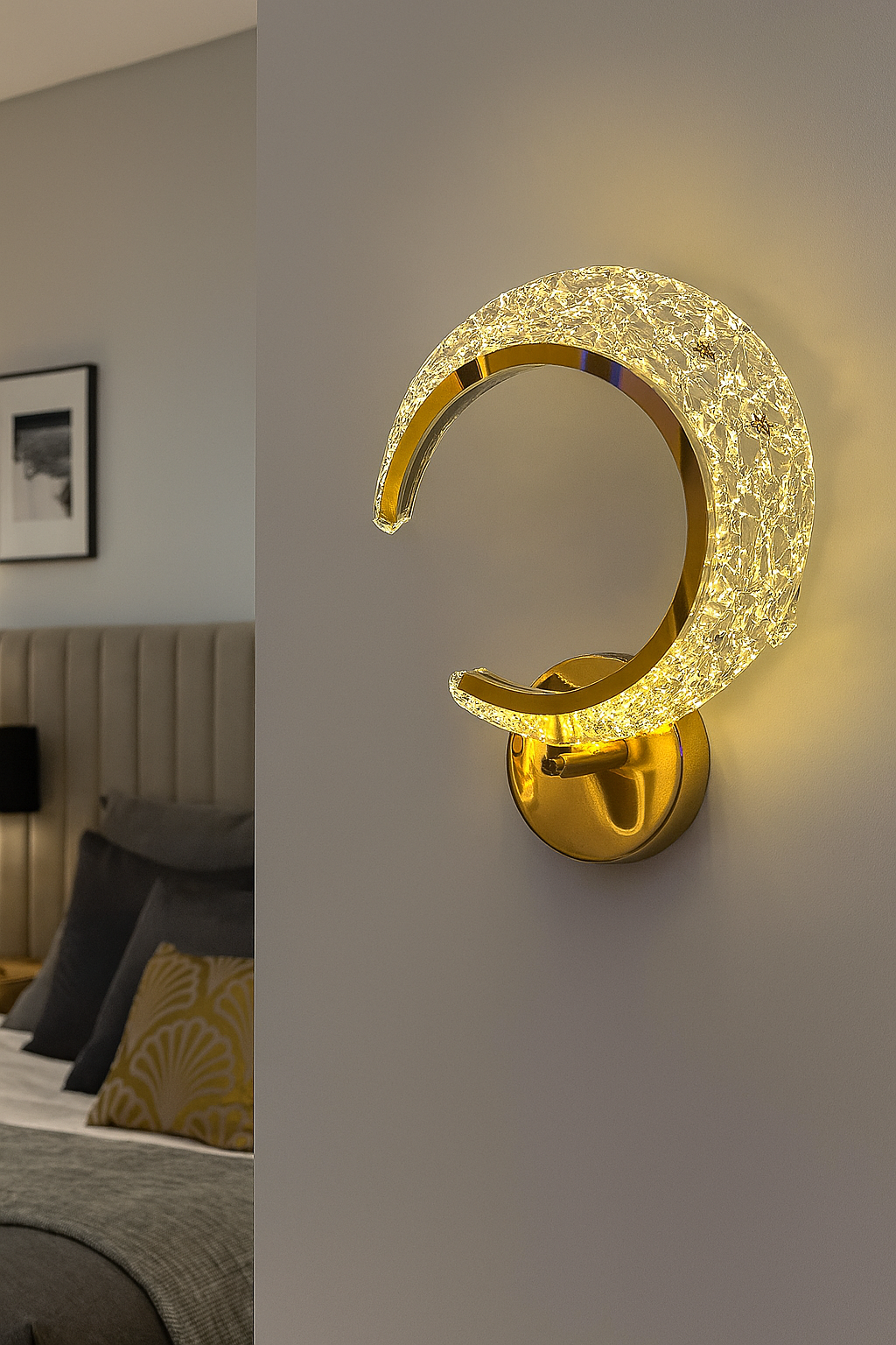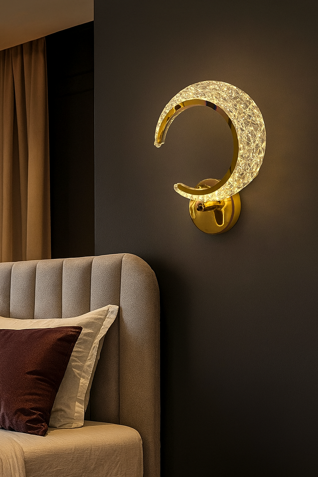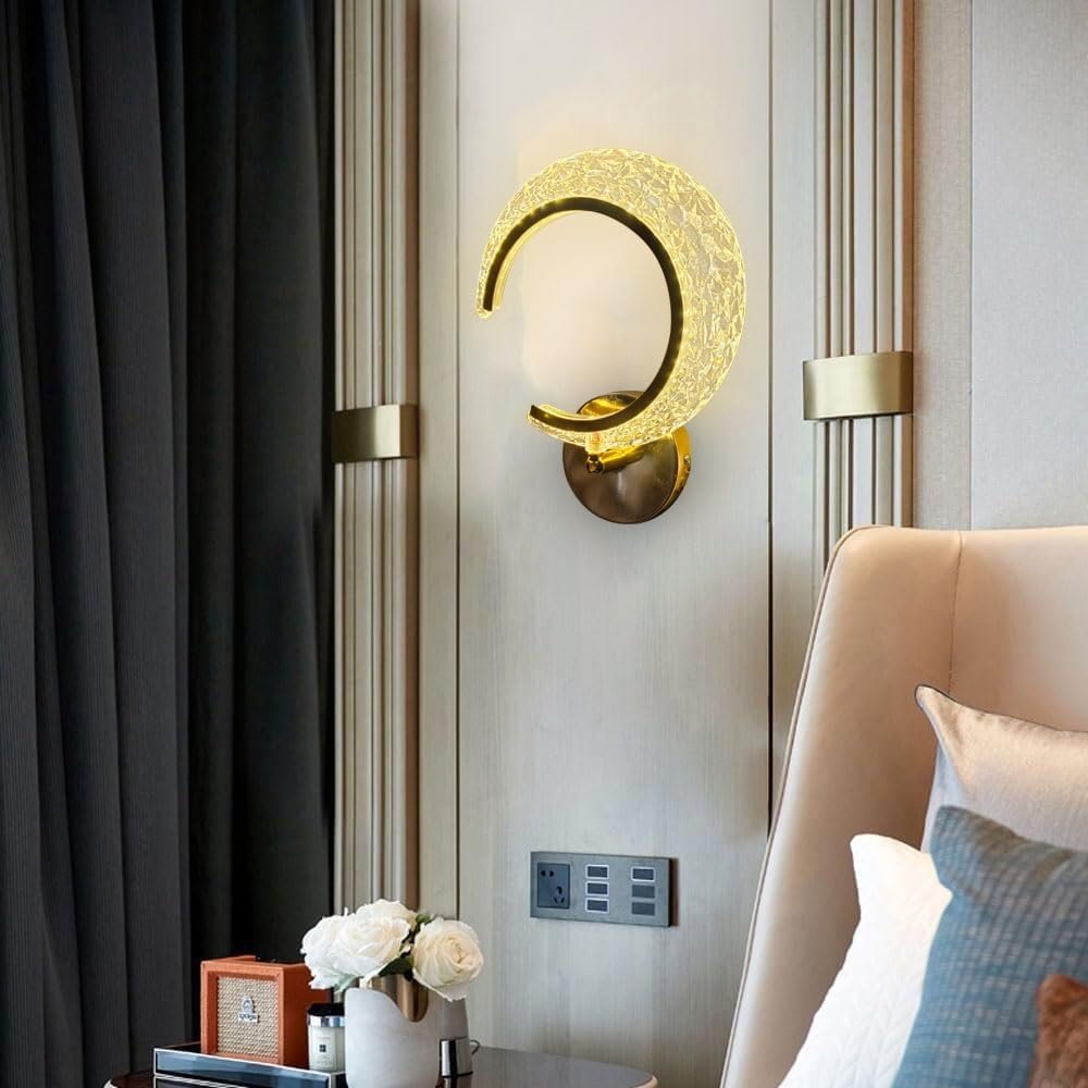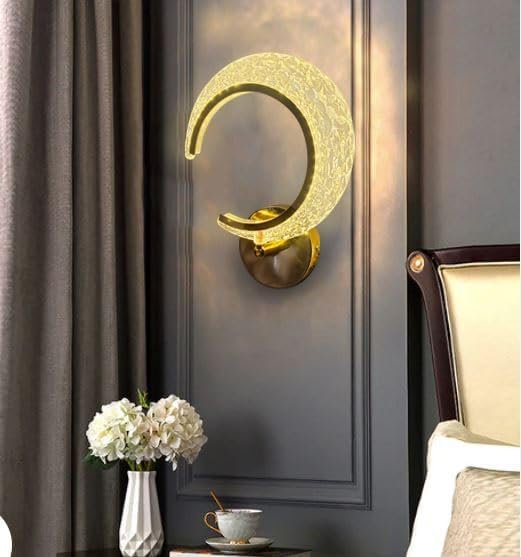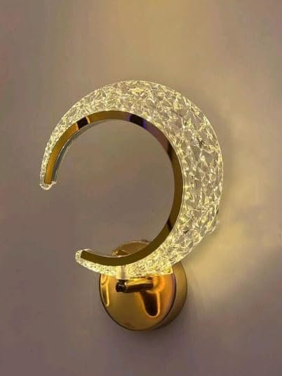 - Elevate the ambiance of your home with this stunning Luxury Crescent Wall Light, a perfect blend of modern design and elegant functionality. Designed to resemble a glowing crescent moon, this light fixture adds an artistic and luxurious flair to any interior setting. Crafted from a durable metal base and embedded with a high-quality crystal-textured acrylic surface, this light diffuses illumination beautifully, creating a warm and White And Neural White inviting atmosphere.