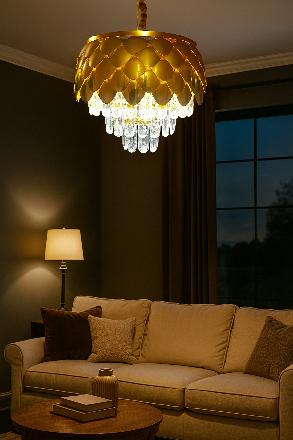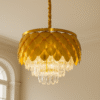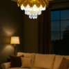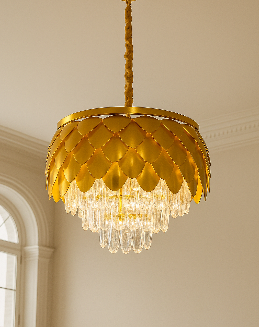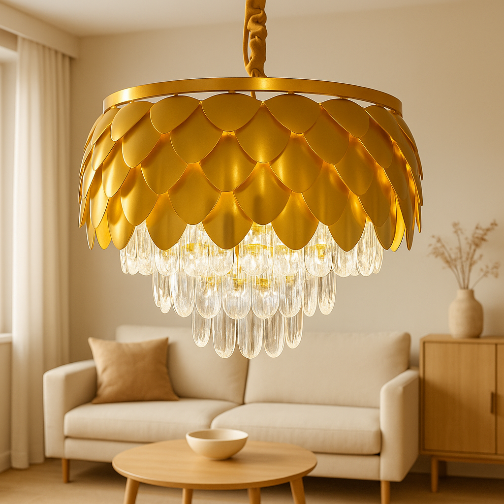 - This chandelier features a gold-finished metal frame shaped like overlapping petals, inspired by classic floral architecture. The layered metal design gracefully conceals a cascade of high-clarity crystal droplets, which reflect and refract light to create a dazzling and inviting ambiance. Each crystal is cut to precision, offering maximum sparkle and a premium visual appeal.