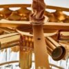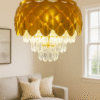 - This golden metal and crystal chandelier isn’t just a source of light – it’s a statement piece. Whether you’re revamping your home décor or upgrading your workspace, this masterpiece will instantly infuse style, elegance, and brilliance into your environment.