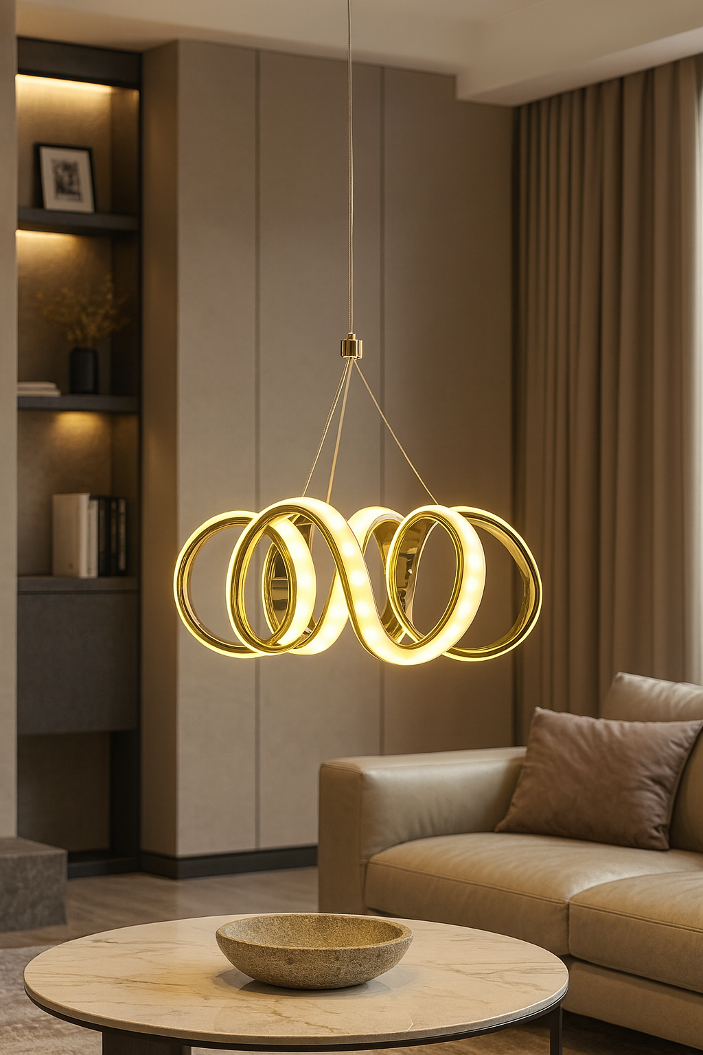Its unique loop- Curvy shape works beautifully with both minimalist and luxurious interiors. Ideal for living rooms, dining areas, bedrooms, hallways, offices, cafés, boutiques, or luxury stores, it blends modern elegance with functional lighting.