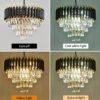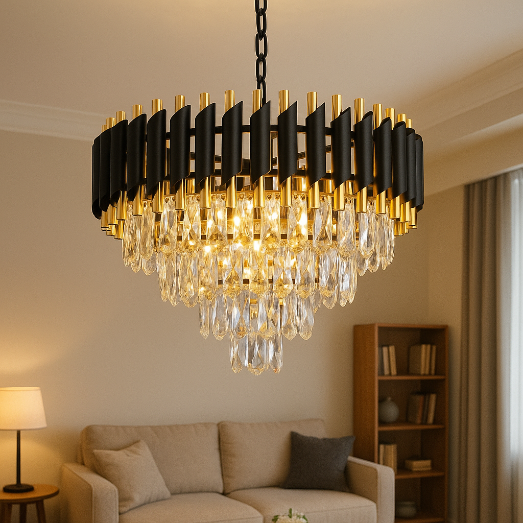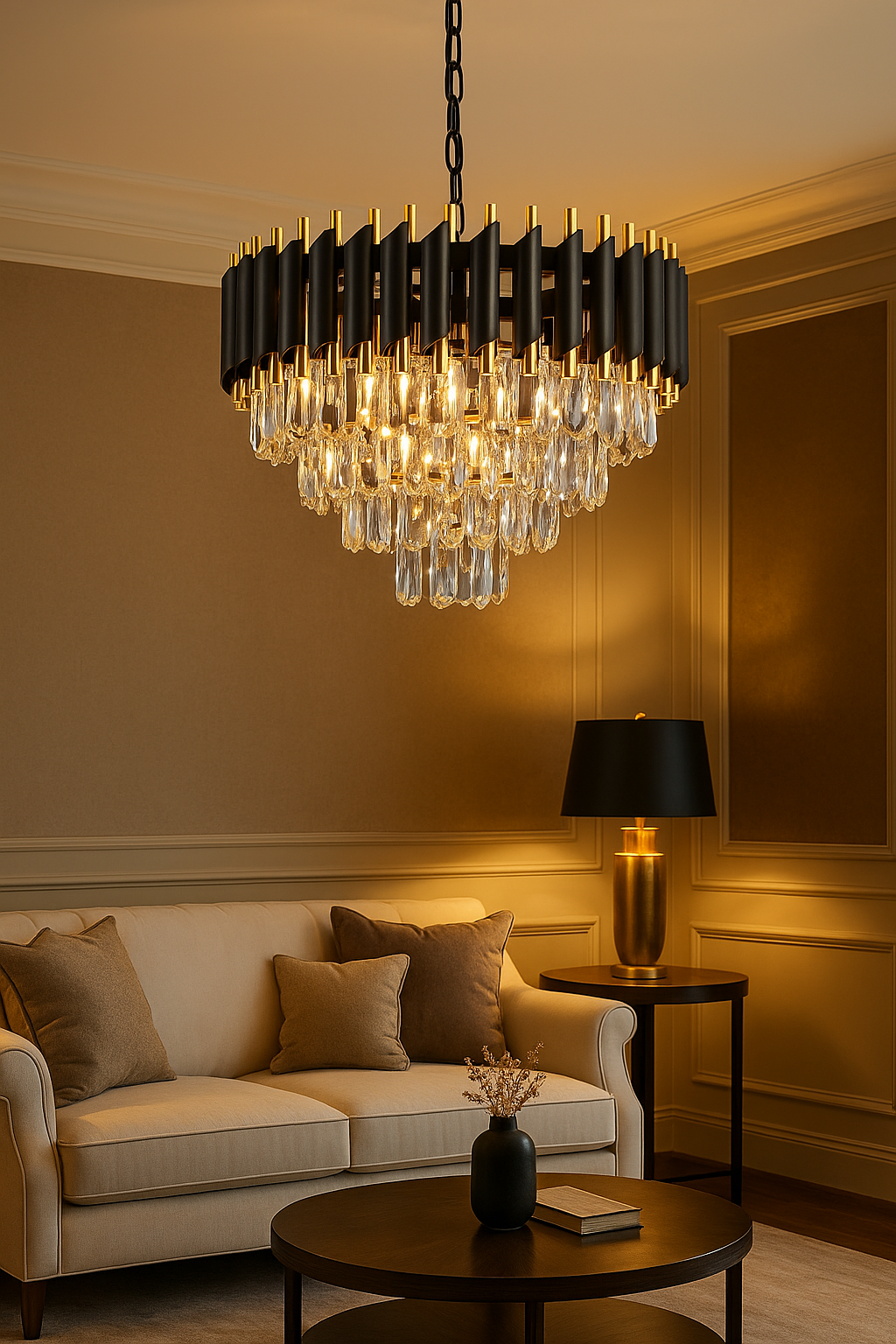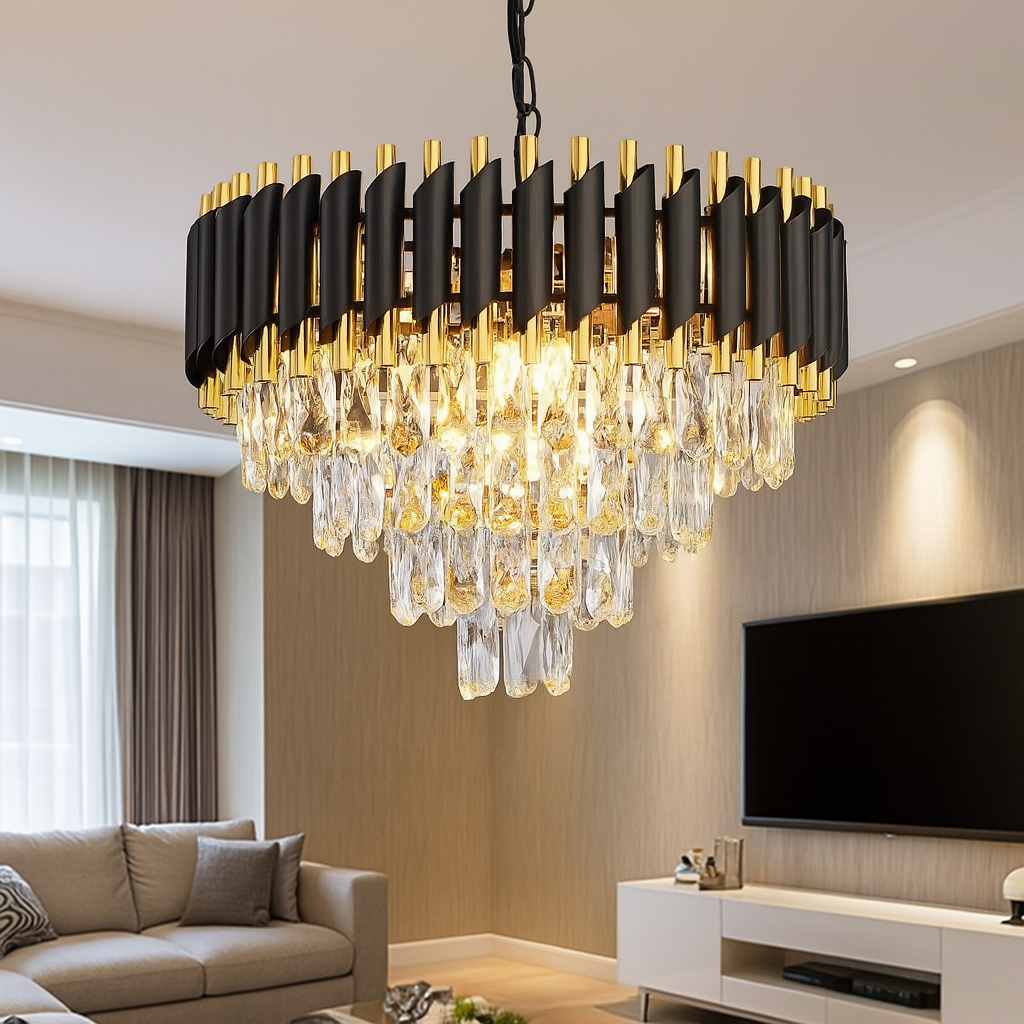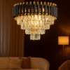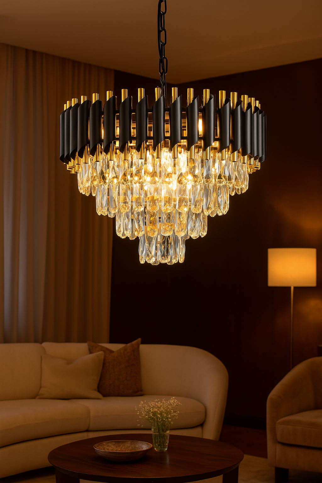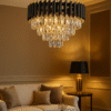 Crafted with a durable metal base finished in a rich Black tone, this chandelier features premium-grade crystals arranged in cascading layers that reflect and refract light beautifully, creating a dazzling ambiance. The intricate detailing adds a sense of grandeur and sophistication to your interior décor.