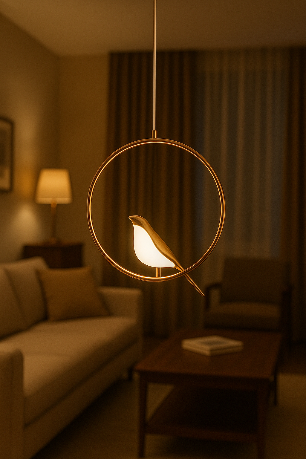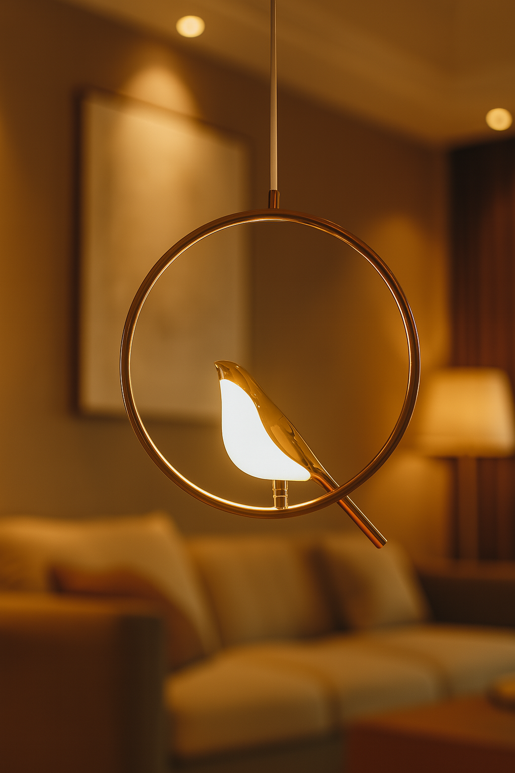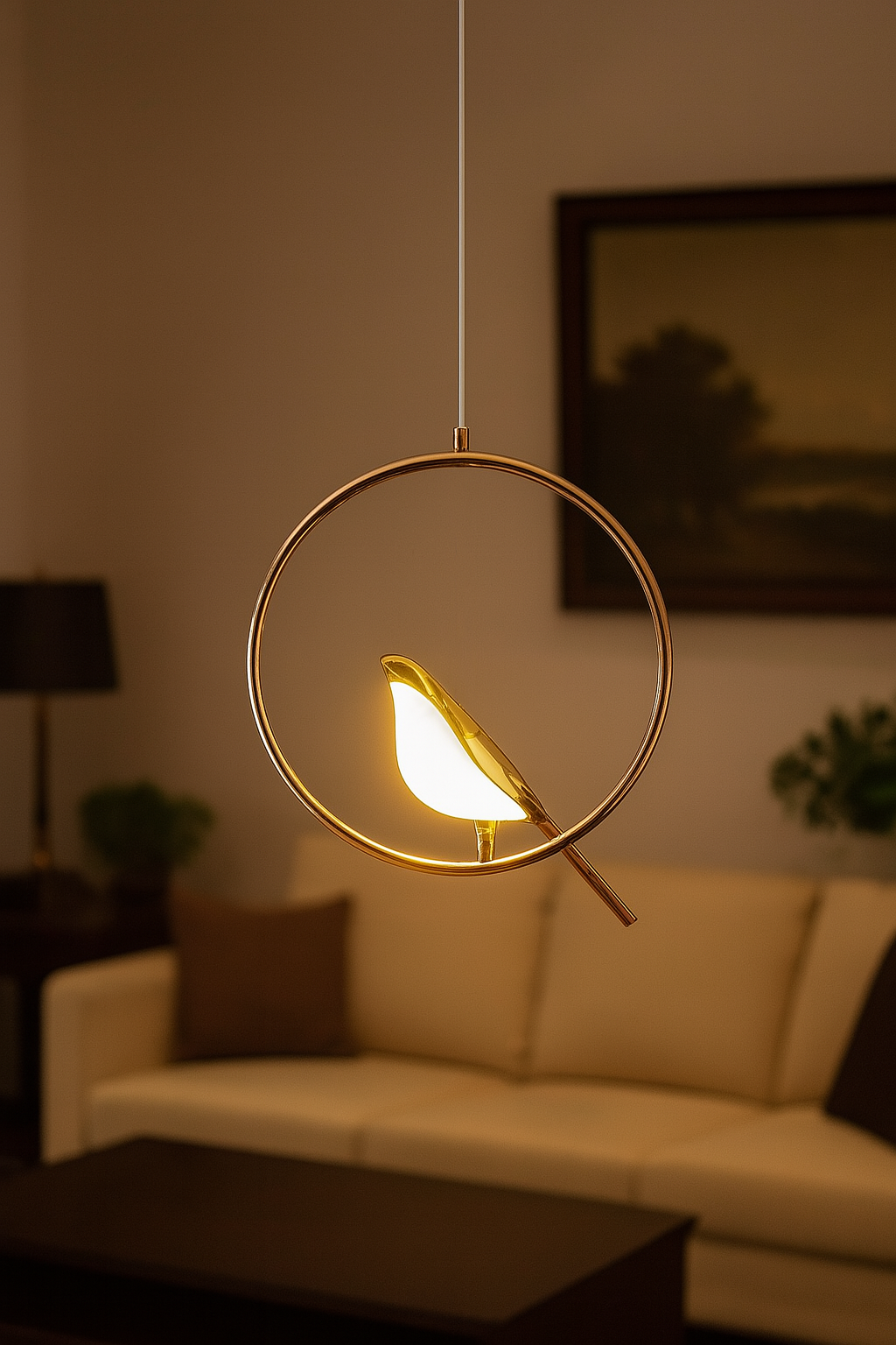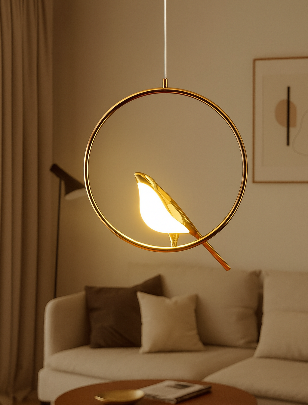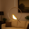 Elevate your home décor with this elegant Bird Design LED Pendant Light, crafted to bring warmth and sophistication to any space. Featuring a sleek golden ring frame and a delicately sculpted bird-shaped LED lamp, this unique fixture blends modern artistry with soft ambient lighting. Perfect for living rooms, bedrooms, dining areas, or reading nooks, it creates a cozy and inviting atmosphere. The energy-efficient LED light offers a gentle glow, enhancing your room’s aesthetics while conserving power.
