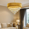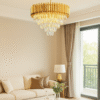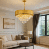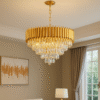 Crafted with a durable metal base finished in a rich gold tone, this chandelier features premium-grade crystals arranged in cascading layers that reflect and refract light beautifully, creating a dazzling ambiance. The intricate detailing adds a sense of grandeur and sophistication to your interior décor.