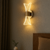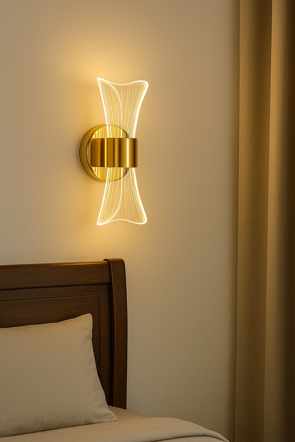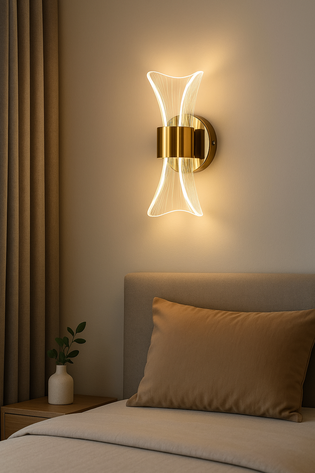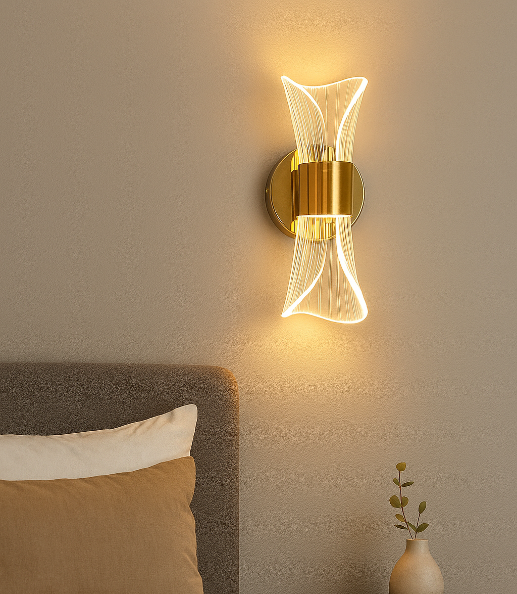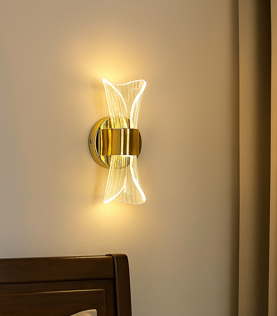 - Add a touch of elegance and warmth to your space with this Luxury Modern LED Wall Light. Crafted with a golden metallic base and a beautifully curved acrylic light diffuser, this wall sconce emits a soft, ambient glow perfect for bedrooms, living rooms, corridors, and even hotel interiors. Its symmetrical, artistic design not only provides functional lighting but also enhances your wall décor with a sophisticated charm.