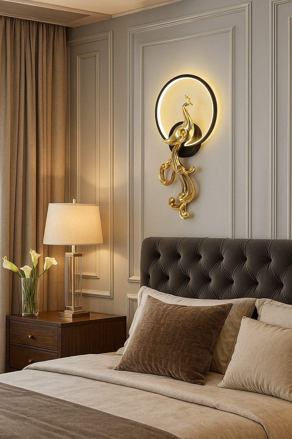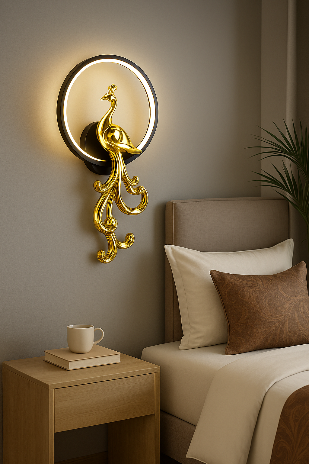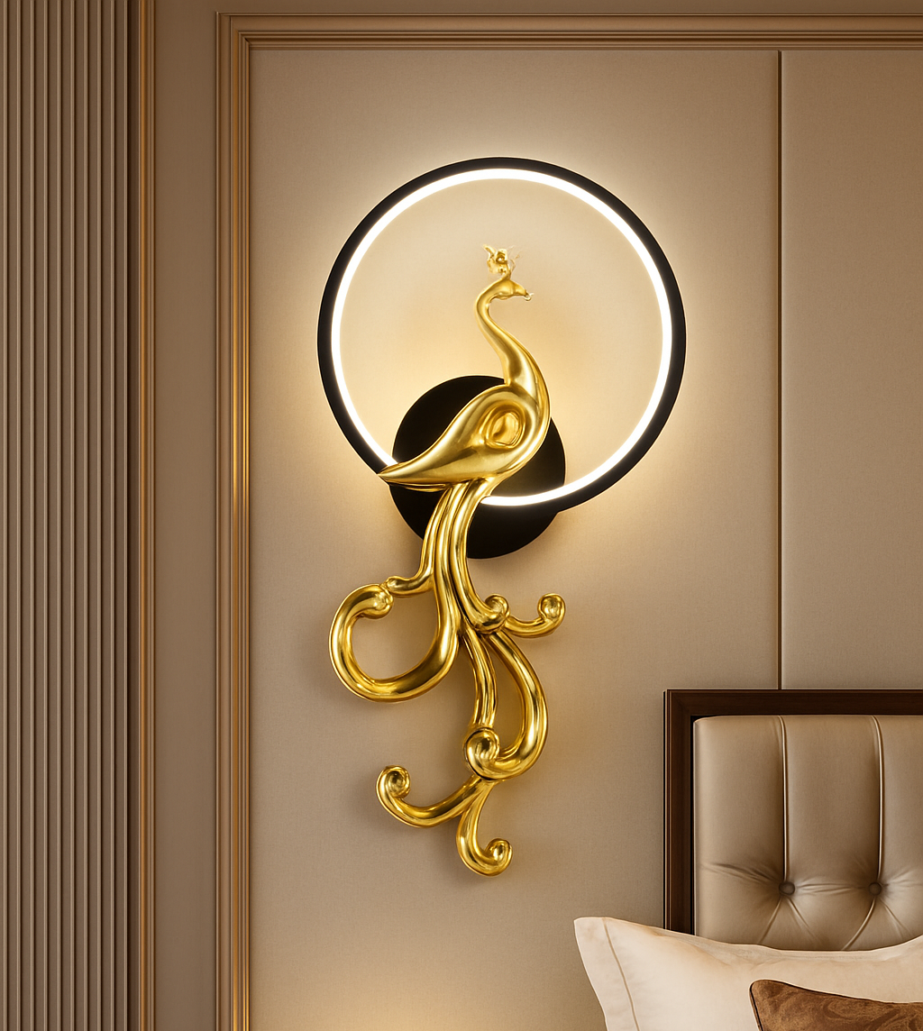• Elevate your interior with this stunning Golden Peacock Wall Lamp, a perfect blend of art and illumination. Crafted in a majestic golden finish, the lamp features a beautifully sculpted peacock gracefully perched within a glowing LED ring. Its soft, ambient light creates a warm and inviting atmosphere, ideal for bedrooms, living rooms, or hallways.